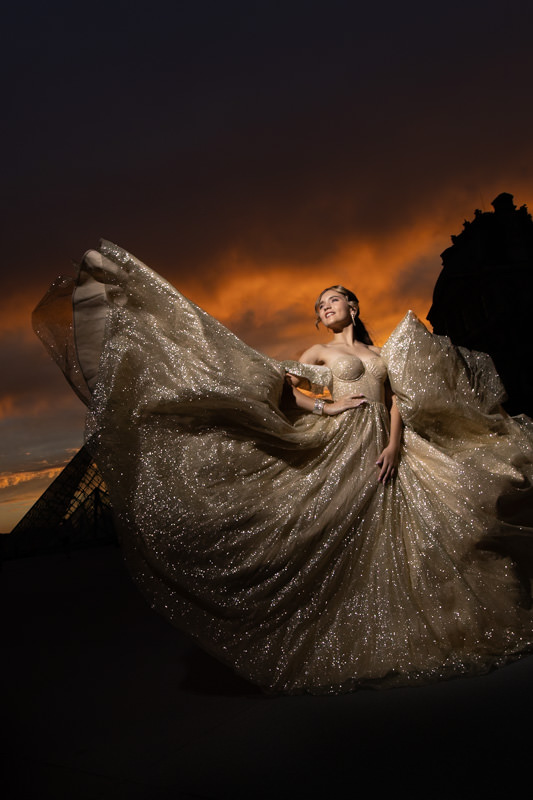 The ideal time for a Quinceañera photoshoot is usually at sunrise. This allows us to take advantage of the soft and warm morning light, creating a magical atmosphere for the photos. However, Antoine also offers nighttime photo sessions. During the “Blue Hour,” when the city lights sparkle and the sky has a deep blue or reddish glow, you’ll have a truly unique and artistic result. Combining both morning and evening shoots gives you two distinct atmospheres, allowing for different outfits and photo styles.